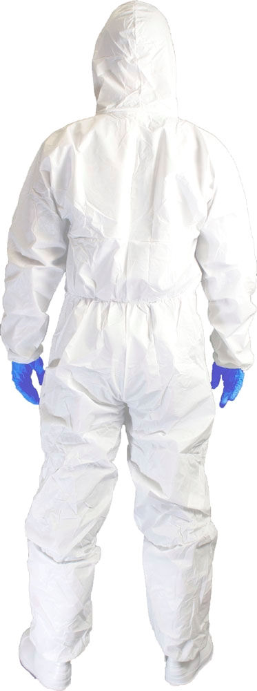 This suit has an elasticated back, hood, cuffs & ankles, and an adhesive cover flap for additional sealing.